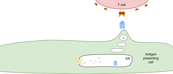 TCRs survey the intracellular proteome by exploiting what is effectively the waste-disposal system in cells. When proteins are degraded, they’re first broken down into different-length fragments, and eventually those fragments are broken down into amino acids. But along the way, some of those fragments are shuttled into the endoplasmic reticulum (ER), a compartment inside the cell that contains HLA class I proteins (see figure below). These HLA proteins bind to peptides and take them to the cell surface for TCRs to observe.