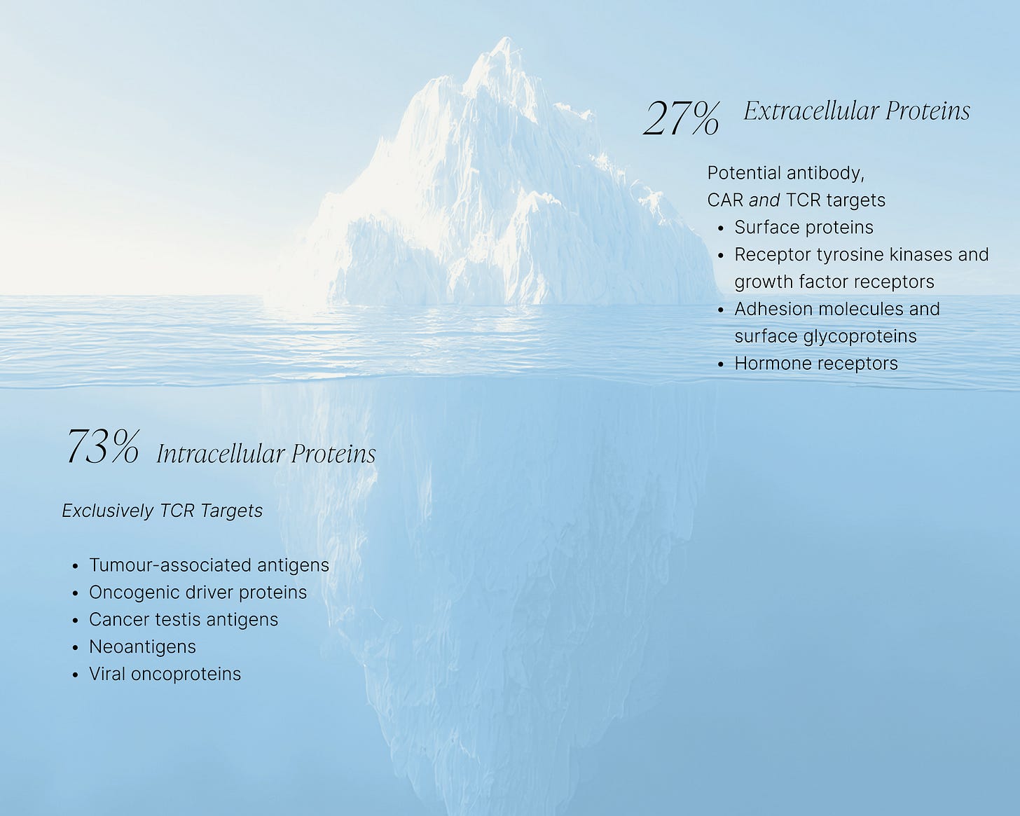 If you’ve been watching the explosion of immune therapies over the past decade, you might think we’ve already mapped the immune system’s potential. CAR-Ts, checkpoint inhibitors, antibody drugs have all changed medicine. However, we have only been fishing in the shallow end: the real ocean of opportunity lies inside the cell, and TCRs are the key to unlocking it. Unlike antibodies that can only “see” the 10–20% of proteins sitting on the cell surface, TCRs can target the other 80–90%, the intracellular world where most disease biology actually happens. This isn’t just a new class of drugs; it’s an entirely new universe of targets across oncology, virology, and autoimmunity that have been completely off-limits until now.